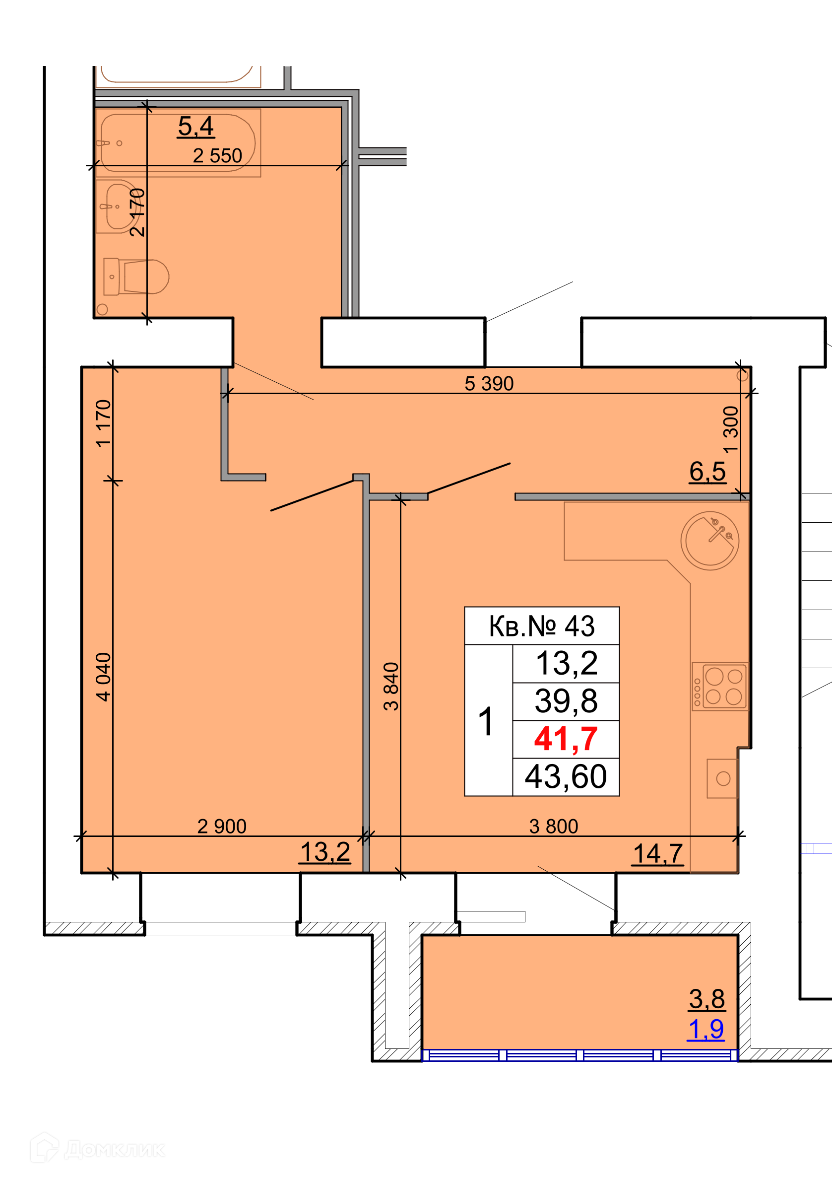 - Общая площадь: 41.7 м²